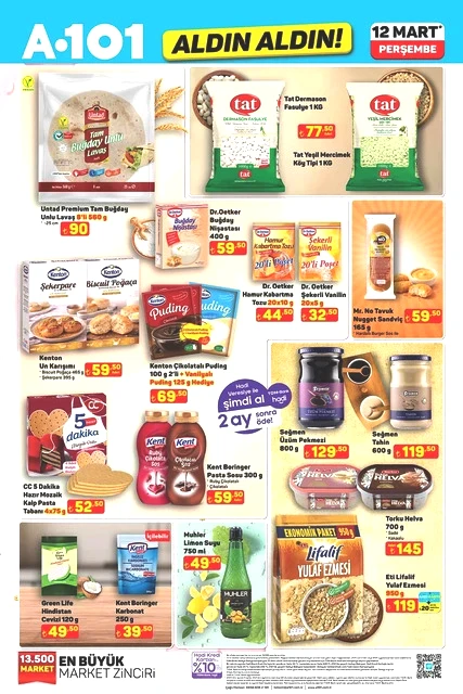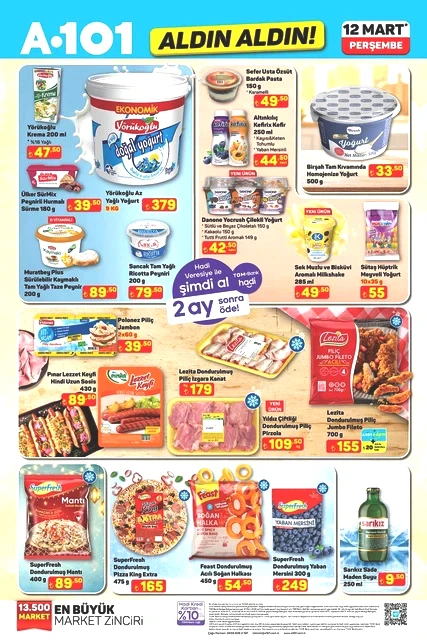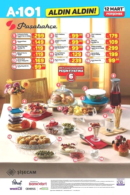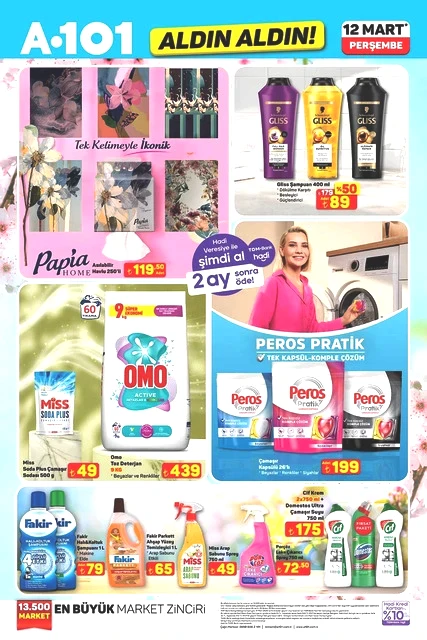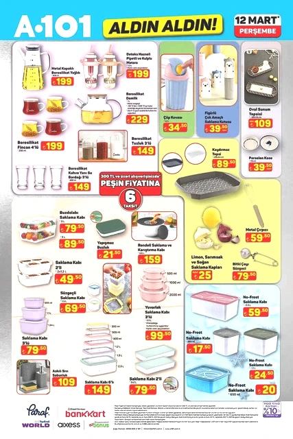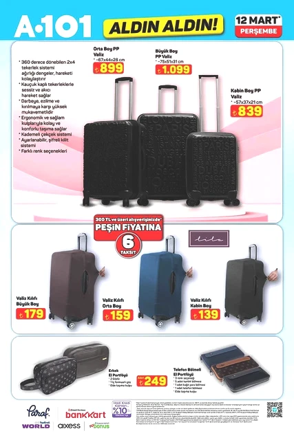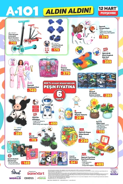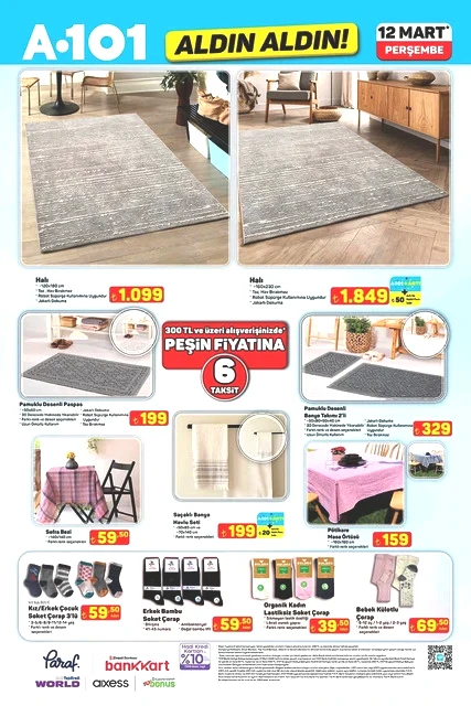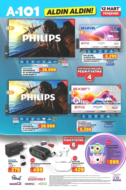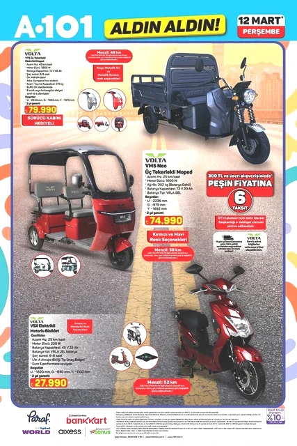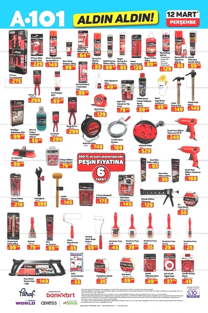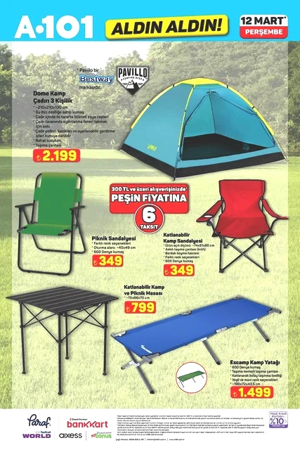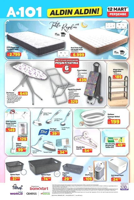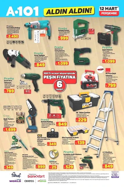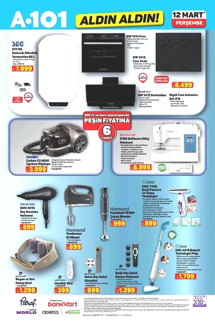 A101, 12 Mart Perşembe günü için indirimli ürünlerini içeren aktüel kataloğunu yayımladı. Bu hafta Perşembe A101 marketlerde televizyon, davlumbaz, fırın, ankastre ürünler, hoparlör, saç kurutma makinesi, elektrikli motorlu bisiklet, elektrik süpürgesi, dikiş makinesi, demlik, saklama kapları, servis tabakları, matkap, sıcak hava tabancası, testere, takım çantası, merdiven, çocuk scooterı, valiz, halı, yatak, ütü masası, pazar arabası ve kamp çadırı gibi çok çeşitli ürünler raflarda yer alacak. A101'in 12 Mart 2026 tarihli aktüel broşürü ile ilgili detaylar haberimizde...